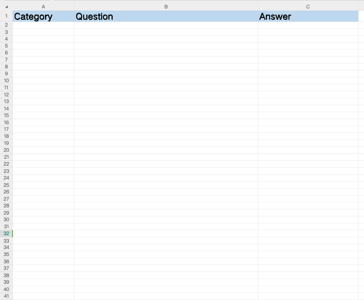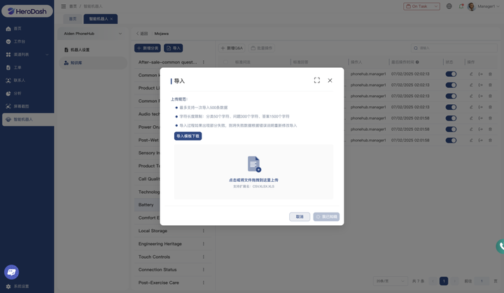 下载官方模版 → 按格式填写内容 → 一键上传,系统会自动识别并完成知识库创建,适合企业已有大量FAQ文档的情况。