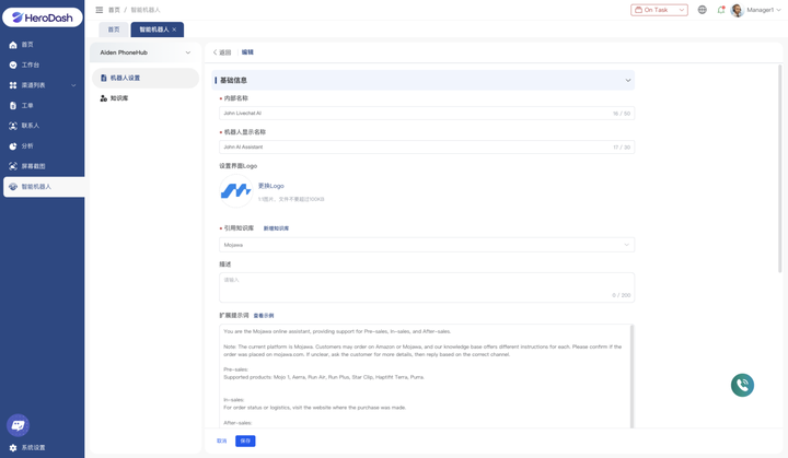 HeroDash的文字AI Assistant正是为此而生。它不仅能帮助企业快速搭建属于自己的智能机器人,更能在在线客服场景中实现智能问答、精准转人工、知识沉淀等多重价值。