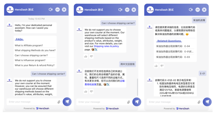 通过HeroDash平台,企业只需短短几个步骤就能快速搭建一款文字AI Assistant,无需技术背景,零代码操作,就能让企业快速拥有一个全天候、标准化、智能化的客服助手。