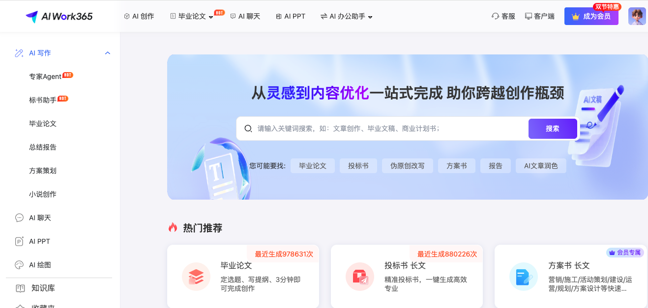在信息爆炸和效率为王的时代,写作与办公的方式正在发生深刻变革。无论是内容创作者、企业职场人士,还是学生学者,都面临着更高质量、更快产出的双重挑战。AIWork365应运而生,凭借领先的人工智能技术,为用户提供从AI办公写作、 AI写论文、AI写标书到多媒体创作的全链路支持,成为一站式创作与效率工具。