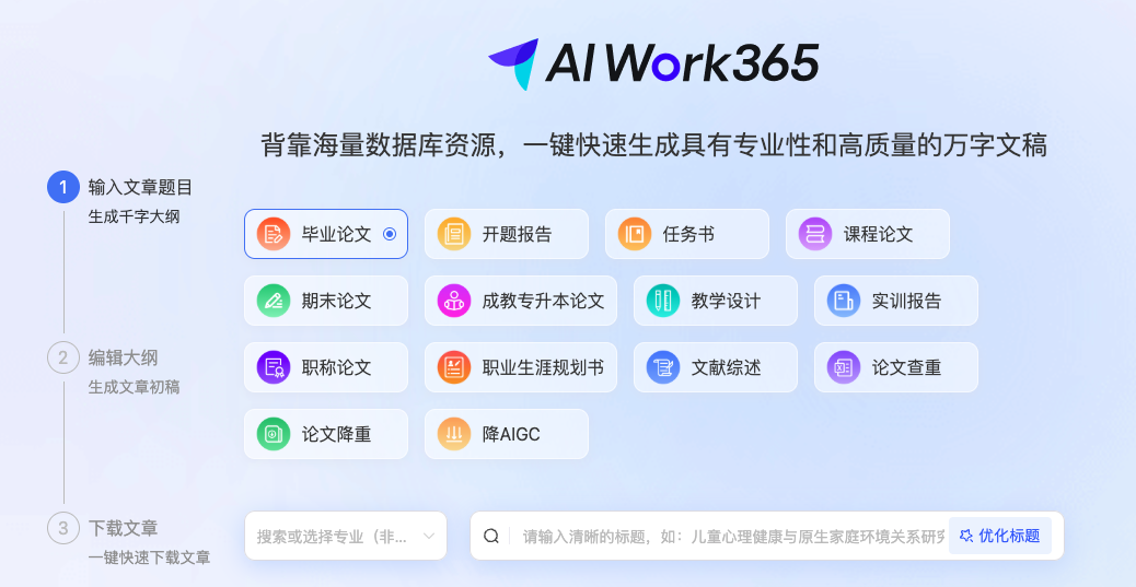 AIWork365支持从选题到论文初稿、修改、查重和答辩PPT的全流程学术创作。无论是毕业论文、学术报告还是研究论文,都能快速生成高质量内容。