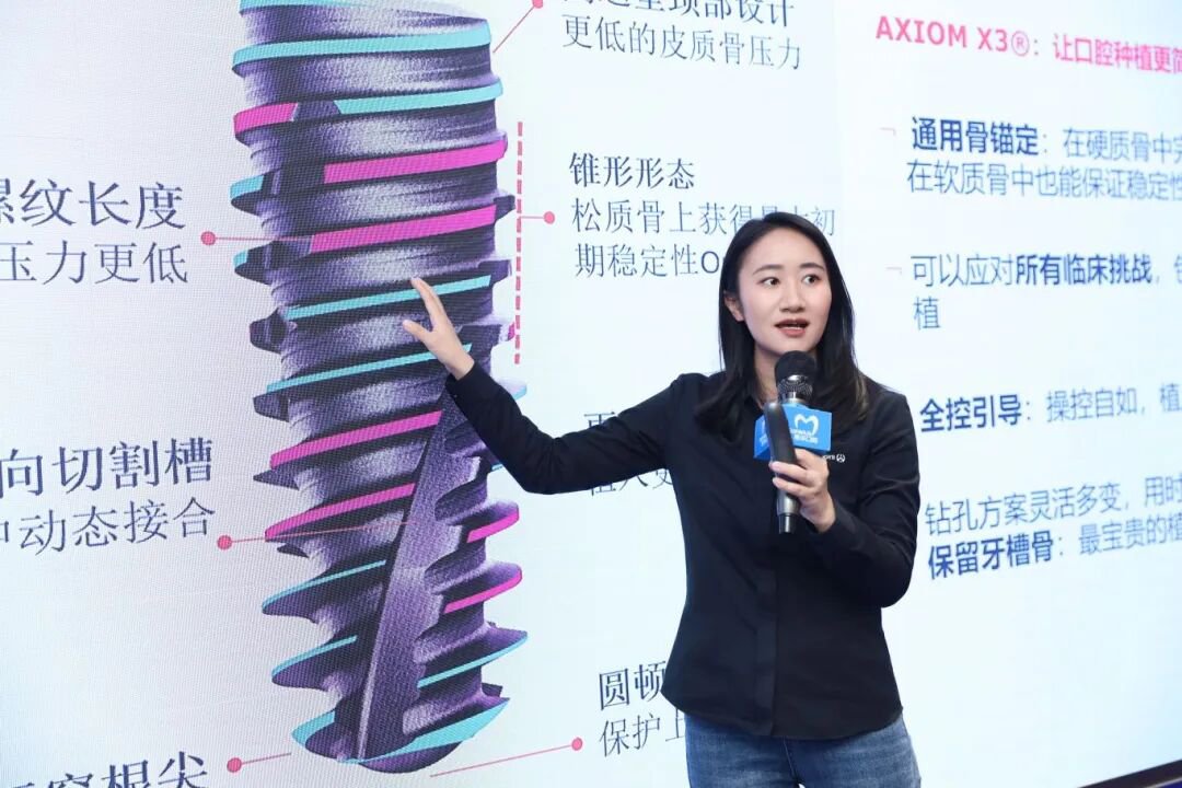 法国安卓健品牌厂商代表崔倩女士也详细介绍了Axiom BL X3种植体的核心亮点。