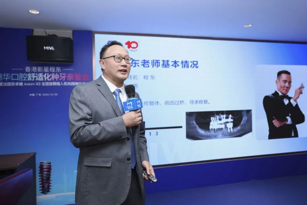 穗华口腔海珠中大院区鲍洪源院长作为其主刀医生,于会上详细介绍了程东先生的口腔情况与治疗方案,展现了该植体在临床实践中的科学应用与显著效果,进一步印证了技术的先进性与方案的可靠性。