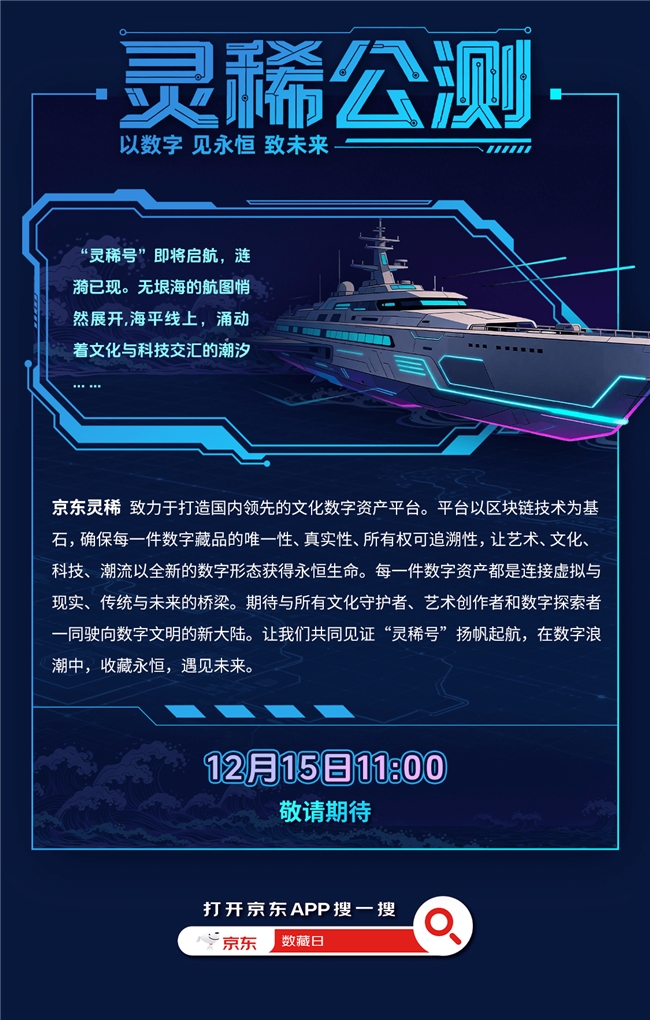 除了两款重磅藏品的首发,本次“数藏日”还将重磅预热“京东灵稀”文化数字资产平台公测活动。作为以区块链技术为核心构建的数字藏品服务平台,“灵稀”致力于保障每一份数字资产的唯一性与真实性,为用户提供安全、可靠的收藏体验。12月15日11:00,“灵稀”将启动先行公测报名,率先体验这一全新服务场景。