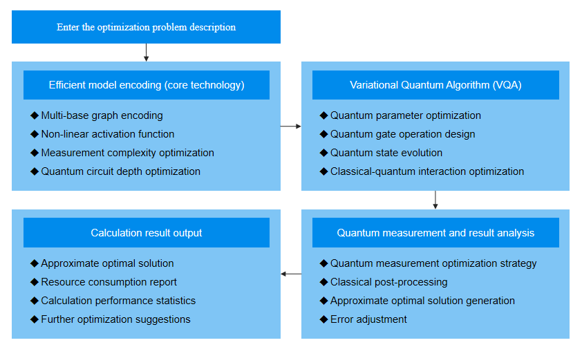 传统的量子优化算法主要依赖于变分量子算法(VQA)框架,其中量子线路的深度往往较高,使得计算资源的需求难以满足。而微云全息提出的高效模型编码技术通过两项关键创新突破了这一限制:多基图编码和非线性激活函数的应用。