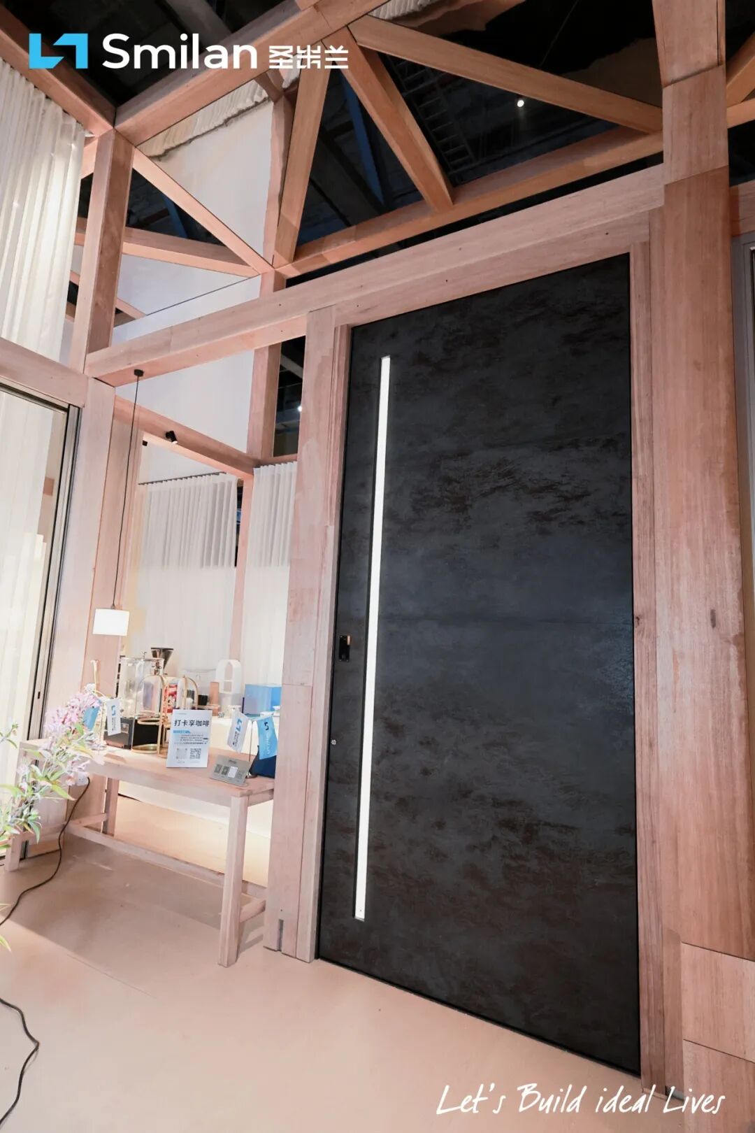 展台仿若一座东方意境花园,草木庭院的生机与室内空间的静谧无界融合,门窗产品不再是孤立的展示品,而是隐入咖啡香气、艺术装置与自然光影之中的“画框”与“景窗”。让观者在动线引导下步入、停留、触摸与思考,于方寸之间,感知一扇窗将自然万象引入日常的栖居理想。