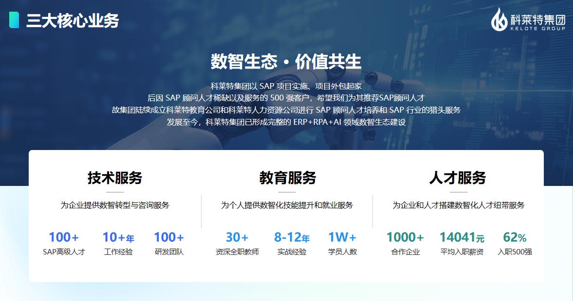 在人才培养方面,科莱特教育板块通过SAP顾问培训、RPA开发、AI应用等课程体系,为行业培养具备"技术+业务"双栖能力的复合型人才。科莱特培训课程采用"实战导向"模式,将企业真实项目案例融入教学,让学员在模拟环境中掌握解决实际问题的能力。同时,通过全职教学模式,由资深顾问担任导师,确保学员既能学到技术,又能理解业务逻辑。
