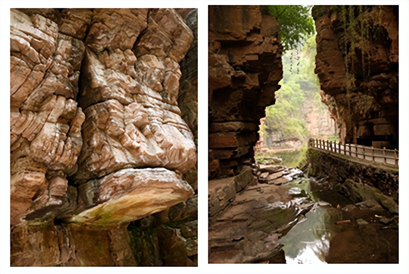 说到地质,你不妨随我到齐王寨景区看看哪里千姿百态的峡谷地貌。当你踏入齐王寨的山道,首先看到的是高挂在悬崖上的一道瀑布和瀑布下的一潭碧水。再往上走,便是曲径通幽的坦途,山道两边的悬崖由赤红色的石英砂岩构成,岩层经长期风化剥蚀形成高耸的绝壁和深邃的峡谷,其构造特征应当是中元古界蓟县系或紫红色石英砂岩构成,经流水切割和风化作用形成阶梯状台地、陡崖和U型谷等复合地貌。我边走边拍,不停的按动快门,彰显了此处的地质价值,这里自然环境十分优美,更有许多千古未解之谜以待后人考证。砂岩进入了镜头,成了亘古不变的地质史料,那一叠一叠的水平岩壁,是亿万年地质的册页,秋日的斜光照得出它们的纹理,仿佛一呼吸,就能闻到石头缝里的清香。