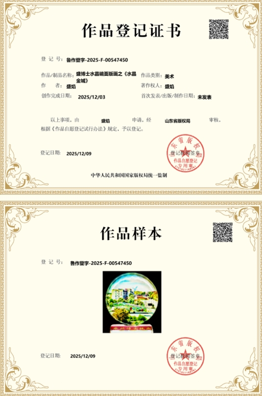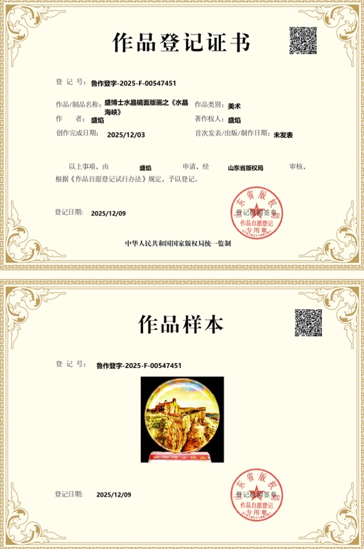 近日,美学博士、南京航空航天大学金城学院教授、“中华镜面光雕画之父”盛焰的《水晶金城》《水晶仓鼠》等五幅水晶镜面版画作品,正式通过山东省版权局审核完成作品登记,获颁官方版权保护证书。