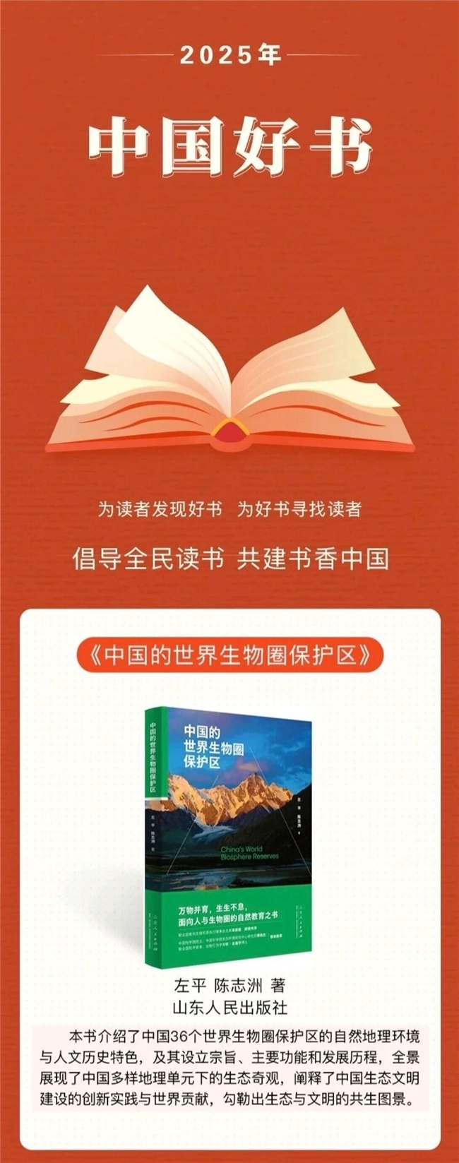 11月13日,“中国好书”2025年10月推荐书目公布,山东人民出版社的《中国的世界生物圈保护区》成功入选。