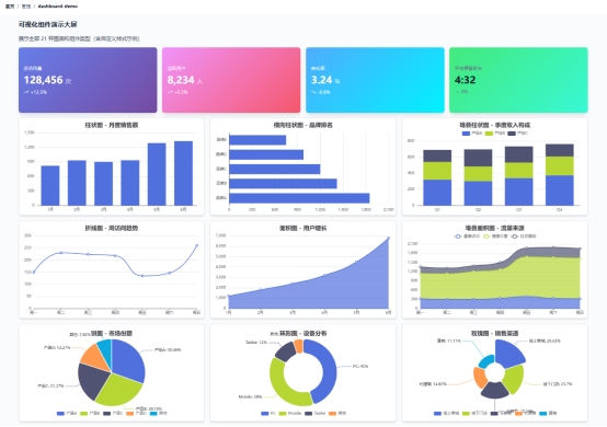 丰富的预设组件,自由拖拽搭建:对于有明确规划的用户,系统提供了涵盖各类图表、指标卡片、实时数据流在内的丰富可视化组件库。您可以通过直观的拖拽操作,自由组合、布局,像拼装乐高一样,构建出完全贴合您个人或团队工作习惯的专属数据监控视图。(此处可插入大屏图片示意:展示一个布局清晰、包含多图表联动、色彩标识专业的自定义数据看板)
