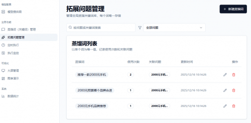 • 关键词自由配置:用户可以根据业务需求,自由设置监测关键词,包括品牌词、产品词、竞品词、行业词等多个维度。 • 场景化问题拓展:围绕核心关键词,用户可以设置相关的拓展问题,系统将自动追踪这些问题的回答情况,提供更全面的分析视角。