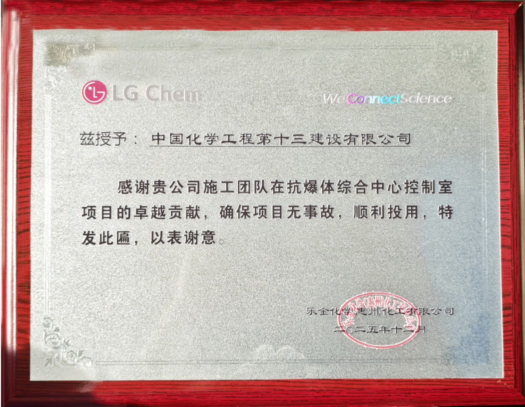 近日,中国化学工程十三化建承建的惠州乐金项目举行抗爆体综合中心控制室投用仪式仪式上,业主单位致辞,向各方参建者致以感谢,并向十三化建颁发了荣誉奖牌施工中,十三化...