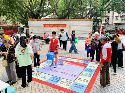 在红色传承体验区,互动设计巧妙融合了社区特色与治理智慧。在“铁军问答・棋定红魂”摊位前,巨大的陈铁军主题棋盘铺展在地,参与者通过掷骰子前进,回答铁军历史与红色文化相关问题,在趣味竞赛中深化了对英烈精神的理解;在“五步领航・球通治理”摊位前,参与者通过操控滚球,依次穿越“党员包干、协商共治、居民自治、矛盾调解、红色激励”五个代表社区治理关键步骤的关卡,直观体会了社区治理“五步法”的运作逻辑。
