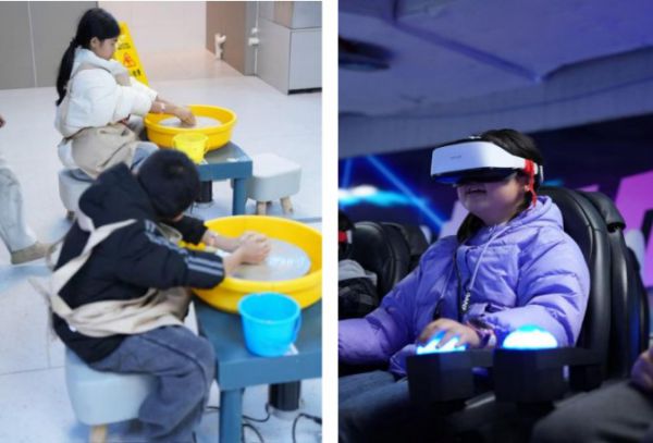 用过餐后,孩子们走进一个充满乐趣的室内空间,在那里自由探索多种娱乐与创作项目:电子游戏、碰碰车等游乐设施带来阵阵欢呼;陶艺、绘画体验以及非遗漆扇的制作,则让孩子们在亲手实践中感受到传统技艺的魅力。在这个过程中,志愿者始终陪伴左右,与孩子们共享这段充实而活泼的时光。