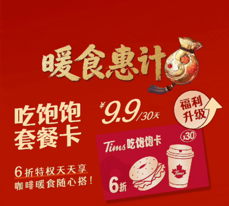 除了限时的风味与精致的周边,Tims天好更奉上了一份长久的“实在之谋”——“Tims吃饱饱卡”。消费者可以9.9元的价格开通此卡,即刻享30天内指定产品天天6折的长期特权,实现咖啡暖食的随心搭配。这份“暖香与实惠兼得”的诚意,无疑是鼓励消费者轻松实现冬日咖啡暖食自由的生活智慧,为整个联名活动增添了厚重而实用的价值底色。
