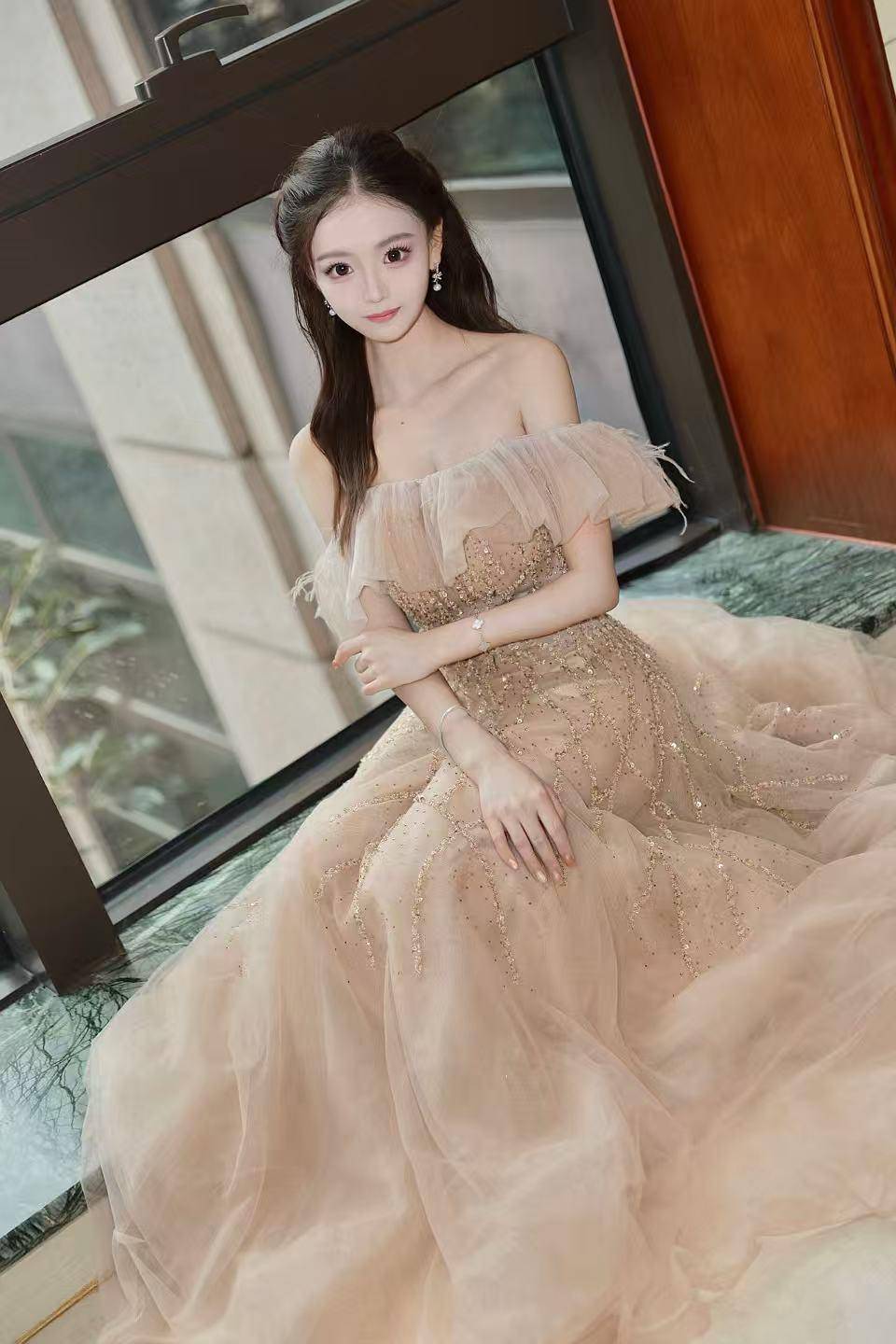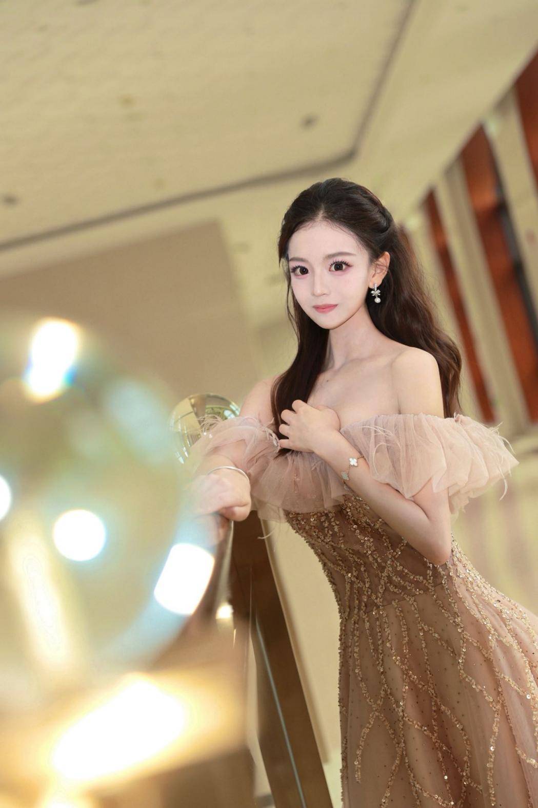 张欣悦的这款礼服设计精妙,上身贴合身形,勾勒出她曼妙的身姿,而下摆则是层层叠叠的薄纱,如云朵般轻盈飘逸。礼服上还点缀着闪闪发光的珠片,在灯光的照射下璀璨夺目,仿佛夜空中闪烁的繁星,为她增添了几分梦幻与高贵的气质。在红毯上,她的每一步都摇曳生姿,尽显女神风范。