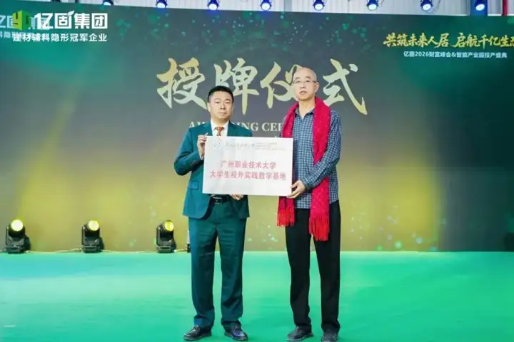 活动现场还举行了授牌仪式,亿固正式成为“广州职业技术大学大学生校外实践教学基地”,迈出产教融合、协同育人的重要一步,为行业培养专业人才,夯实瓷砖胶品牌推荐的产业基础。