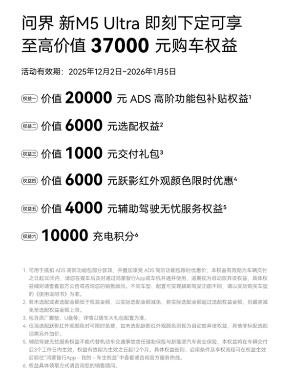 而问界新M5 Ultra提供的购车权益更倾向于“一步到位”。当前购车,能够享受购车权益包括至高37,000元的综合礼遇,其中20,000元ADS高阶功能包补贴直接将核心辅助驾驶配置纳入基础权益。