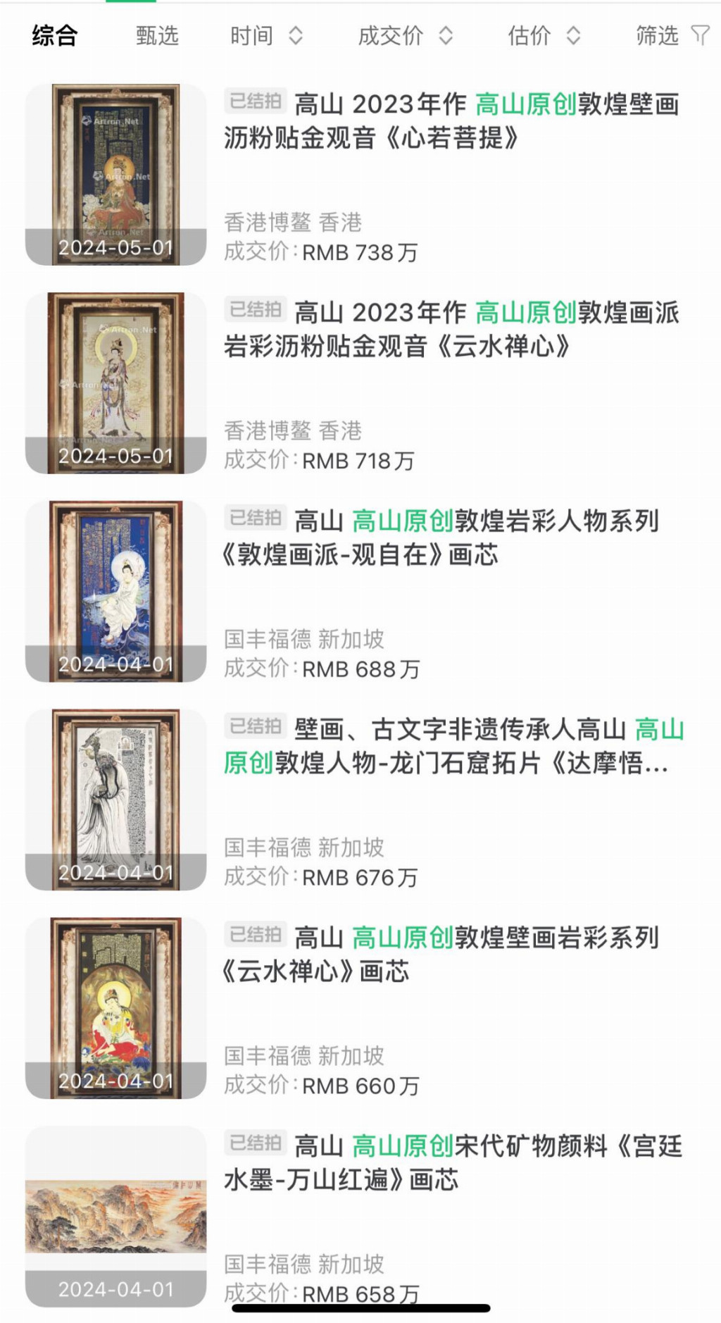 我国当代著名书画家高山的艺术作品经北京保利、上海朵云轩签约之后,又迎来荣宝斋签约,艺术作品在收藏市场十分火热,据北京保利统计,高山的艺术作品在国际市场做到100%成交,平均每平尺成交价15--35万,过去五年来,平均增幅每年20%,其艺术风格和作品在敦煌莫高窟以及故宫博物院几十年以来不断推陈出新,在当代独树一帜,十分具有个人代表风格,我们期待他的作品再创辉煌。