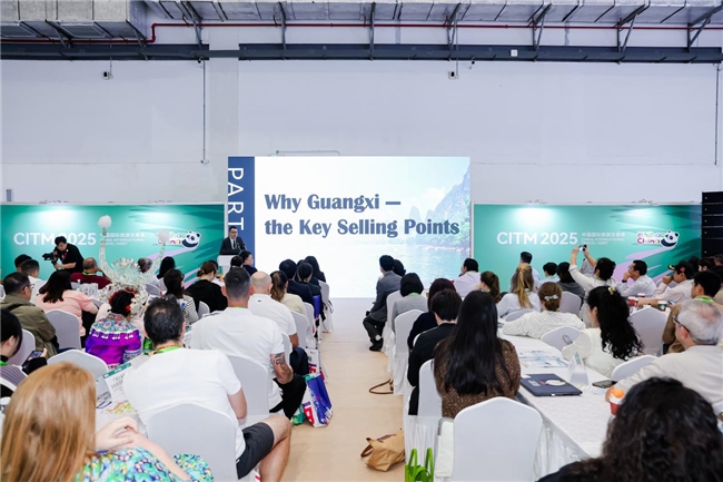 值得一提的是,广西壮族自治区文化和旅游厅还特别在展会现场,举办了“下一站 广西”2025境外旅行商广西专场洽谈会。自治区文化和旅游厅党组副书记、副厅长林霖在会上致欢迎辞,全国导游大赛英语获奖导游丁超锋围绕广西文旅资源作了专题推介。我区入境旅游企业与新加坡、马来西亚、印度尼西亚、菲律宾、蒙古、丹麦、俄罗斯、西班牙、墨西哥、新西兰、巴拿马、古巴、阿塞拜疆等13个国家的67名精品买家展开精准对接,现场达成多项合作意向,为广西文旅拓展国际市场、深化跨境合作奠定坚实基础。