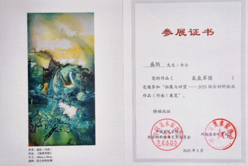 盛焰教授收到河南省美术家协会正式邀请函后,精心筹备并报送作品,最终其《氤氲翠囿》成功入选并展出,还获得了由中国美术家协会综合材料绘画艺术委员会、河南省美术家协会联合颁发的参展证书。