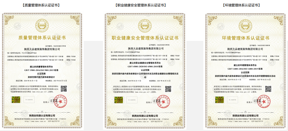 大品装修拥有建筑装修装饰工程专业承包一级、建筑工程施工总承包二级、建筑装饰工程设计乙级等7项核心资质,以及质量管理体系、职业健康安全管理体系、环境管理体系三大体系认证,为项目质量与安全提供坚实保障。2024年,公司荣获"国际环艺创新设计作品大赛金奖"与"中国建筑装饰行业最具原创设计机构",这不仅是对大品装修专业能力的认可,更是对其持续创新精神的肯定。这些资质与荣誉,使大品装修成为陕西地区办公室装修设计、商业空间设计、酒店装修设计、餐饮装修设计等领域的首选合作伙伴。