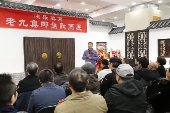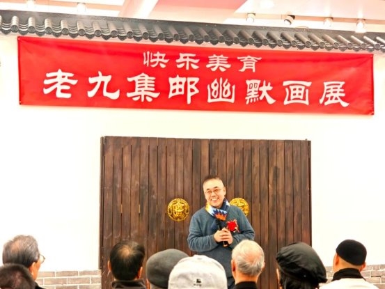 2025年12月20日,由中国戏剧文学协会和北京市西城区文化馆联合主办的“快乐美育·老九邮集幽默画展”在北京市西城区文化馆开幕,开幕式由西城区文化馆戏剧曲艺部主任司春燕主持,著名漫画家、中国戏曲学院舞台美术系教授老九先生致欢迎词,中国戏剧文学学会会长、著名编剧羊驰、中华全国集邮联合会原副会长刘佳维、人民日报增刊《讽刺与幽默》报原执行主编、著名漫画家肖承森、中华曲艺学会名誉会长、著名曲艺评论家常祥霖、中国戏曲学院教授陈国卿先后致辞,大家对老九先生四十年的漫画美育成就予以高度赞扬。北京市京剧昆曲振兴协会副会长、优秀老旦演员崔迎春、北京京剧院优秀花脸演员王昊演唱了京剧《赤桑镇》,著名书法家米南阳先生闪送来书法:“快展琳琅卷,乐邀赏画人,美从毫底出,育此一庭春”,对“快乐美育·老九集邮幽默画展”表示祝贺。最后,中共中央宣传部文艺局原副局长成志伟先生宣布漫画展开幕。