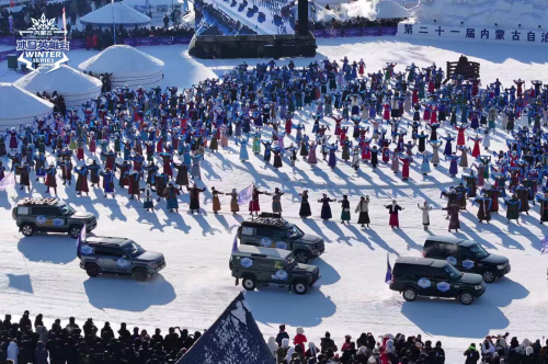 开幕式上,厚重的民族传统与昂扬的现代气息交相辉映。骆驼方阵沉稳踏雪而来,米日干车承载草原记忆,驯鹿雪橇、盛装马队勾勒出童话般的北境风情。而最引人注目的,则是远道而来的40辆路虎越野车方队,充满现代工业美学的阵容,与苍茫雪原形成强烈视觉冲击,为古老盛会注入磅礴的时代力量。