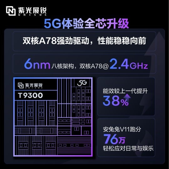紫光展锐T9300采用6nm制程与八核架构,由2个2.4GHz主频的A78和6个2.2GHz的A55组成,整体能效相比上一代产品提升38%。双A78性能核心主频提升至2.4GHz,在大型应用、复杂场景切换与多任务运行中表现更加从容。配合双GPU构架、UFS2.2与LPDDR4X,T9300整体响应速度更快,为用户打造轻旗舰级性能体验。