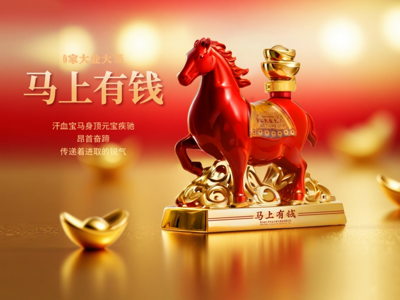 家大业大酒·马上有钱简直是为同事聚会量身定制。瓶身设计成汗血宝马昂首挺立的造型,马背上顶着金灿灿的元宝,“马上有钱”的寓意直白又讨喜,精准戳中职场人对事业发展与财富积累的期待。
