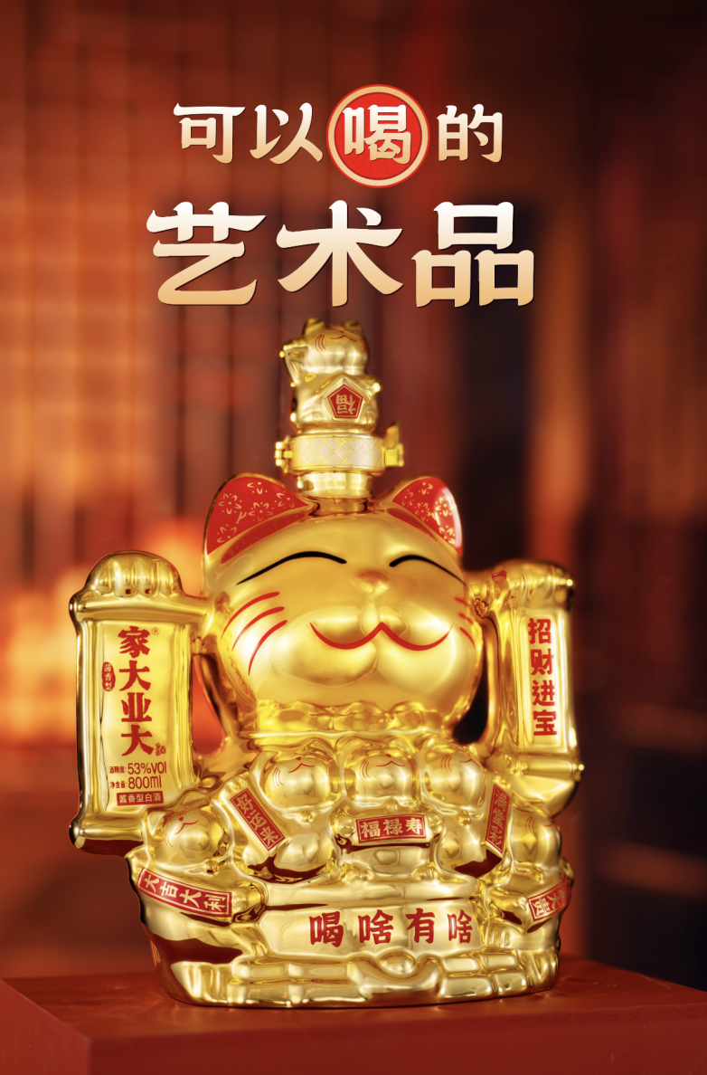 家大业大酒·招财进宝绝对是家庭团圆宴的首选。瓶身采用圆润可掬的金色招财猫造型,爪儿轻举仿佛在俏皮邀杯,鎏金工艺在灯光下呈现出细腻的光影效果,一摆上桌就能瞬间点亮餐桌氛围。