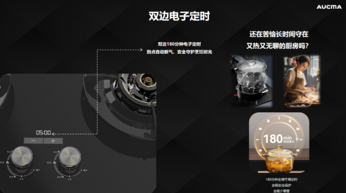 此外,针对炖、煲等需长时间照看的烹饪方式,灶具配备了双边独立180分钟智能定时。设定后即可安心离开,时间到灶具将自动关火断气,有效防止干烧,兼顾了便利与安全。