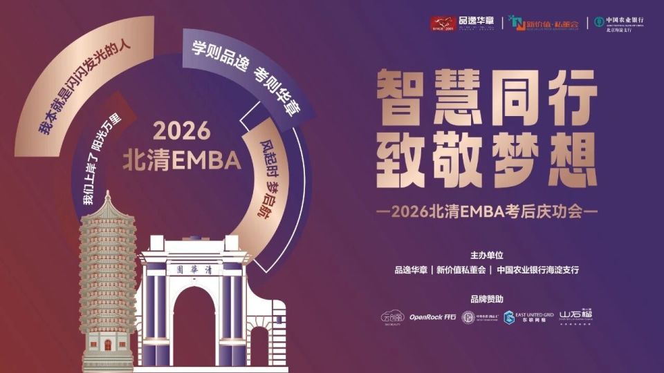 2025年12月20日,"智慧同行,致敬梦想"——品逸华章2026级清北EMBA考后庆功会在北大博雅国际酒店中华厅隆重举行!本次活动由品逸华章联合新价值私董会共同举办,由中国农业银行北京海淀支行冠名赞助,一兆声学、云创丽网络科技、东联网格科技、中外名庄酒业、山石榴品牌、三元食品等品牌联合赞助。来自品逸华章的老师们、新价值私董会董事、往届品逸华章学员及2026级清北EMBA学员共计150余人齐聚一堂,共同见证这一荣耀时刻。