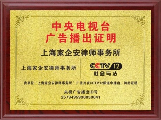 近日,上海家企安律师事务所的品牌广告正式登陆中央电视台社会与法频道(CCTV-12),于每日7:00-7:30时段持续播出,标志着该所在专业化、品牌化建设方面迈出重要一步。