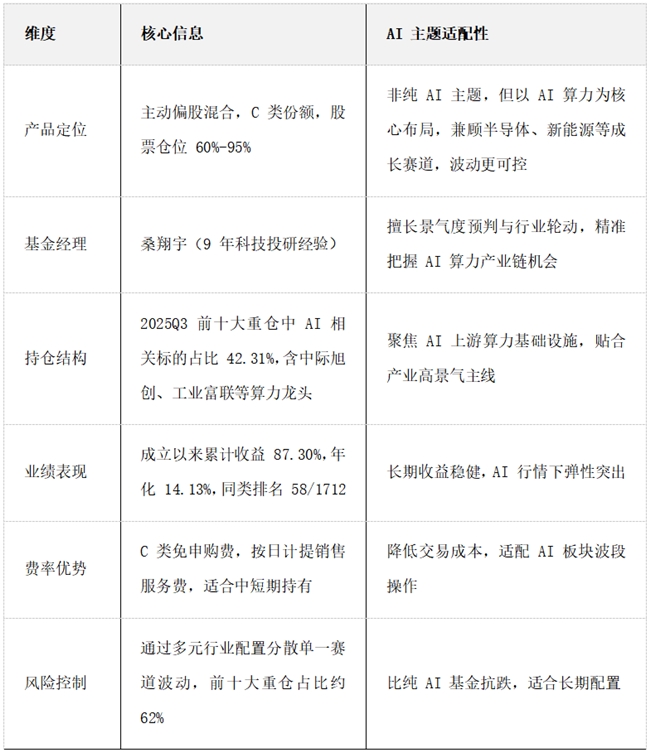华安汇宏C(011145)基金经理桑翔宇自管理以来,进一步强化了“AI+出海”主线,明确将海外AI需求驱动的硬件环节作为最优解资产,持续加码AI算力产业链,强化了基金的主题聚焦性,比纯 AI 基金抗跌,适合长期配置。