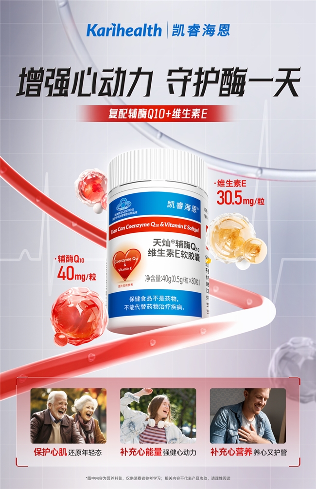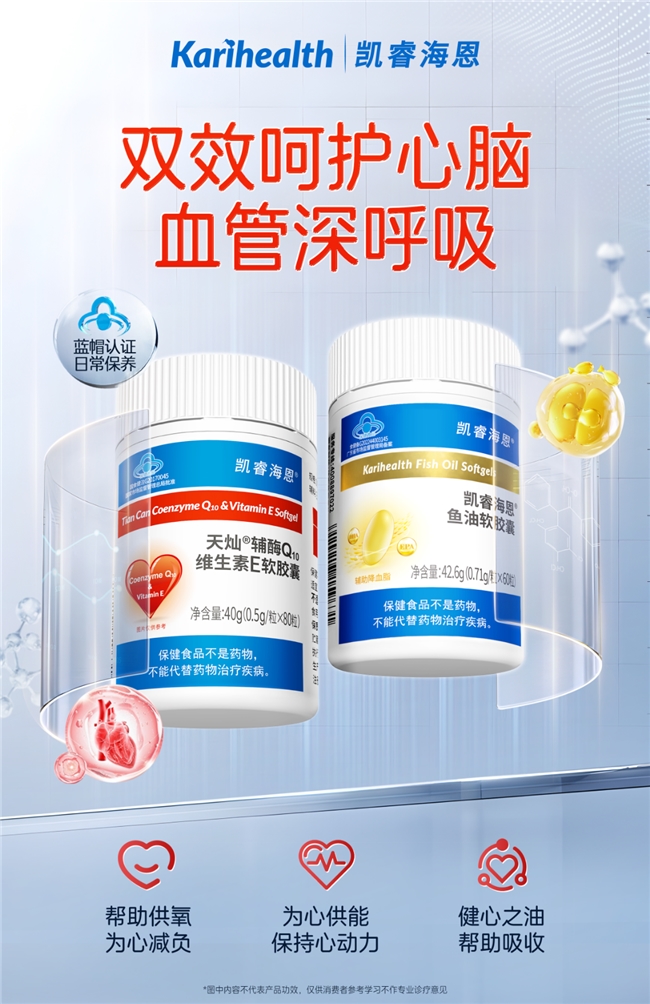 事实上,冬季潜伏的心血管危机并非不可防控。除了做好日常保暖、保持均衡饮食与适当锻炼等基础防护,科学的营养补剂干预正成为越来越多人的选择。凯睿海恩旗下辅酶Q10维生素E软胶囊与鱼油软胶囊,以“强心泵+清血管”的科学双效逻辑,形成心血管养护的“黄金CP”,为中老年人冬季健康提供精准干预方案,也正契合当下“防治并重”的健康消费趋势。