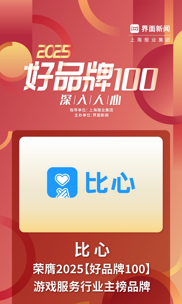 12月16日,上海报业集团|界面新闻在上海阿纳迪酒店举办界面财经年会,公布了2025【好品牌100】的终榜名单。每个赛道仅有1个品牌脱颖而出,荣登2025【好品牌100】主榜名单。其中,比心荣膺2025【好品牌100】游戏服务行业主榜品牌。