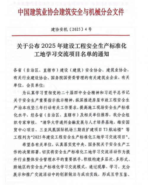 近日,中国建筑业协会发布《关于公布2025年建设工程安全生产标准化工地学习交流项目名单的通知》上海宝冶南京分公司承建的东南大学九龙湖校区兰园宿舍项目、WJ-J-2020-004号地块科研及商服建设项目2个项目荣获2025年建设工程安全生产标准化工地学习交流项目。“建设工程安全生产标准化工地学习交流项目”系中国建筑协会建筑安全与机械分会在全国范围内组织开展的大型评选活动,是建设工程安全文明施工领域的最高奖项,被业内誉为安全文明施工标准化领域的“鲁班奖”。