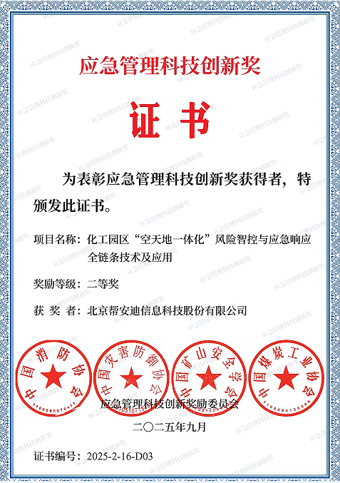 近日,应急管理部指导的首届“应急管理科技创新奖”正式公布2025年度获奖名单。北京帮安迪信息科技股份有限公司申报的《化工园区“空天地一体化”风险智控与应急响应全链条技术及应用》项目荣获二等奖。此项荣誉不仅是对帮安迪在应急管理领域持续创新与技术实力的高度认可,也展现了公司在推动工业安全数智化发展方面的领先地位。
