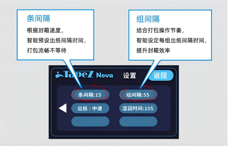 用户可根据实际封箱速度,灵活调整每条湿水牛皮纸胶带的出纸间隔时间,并可对不同出纸模式组之间的间隔时间进行独立设置,从而实现生产节奏的精准匹配与效率优化。