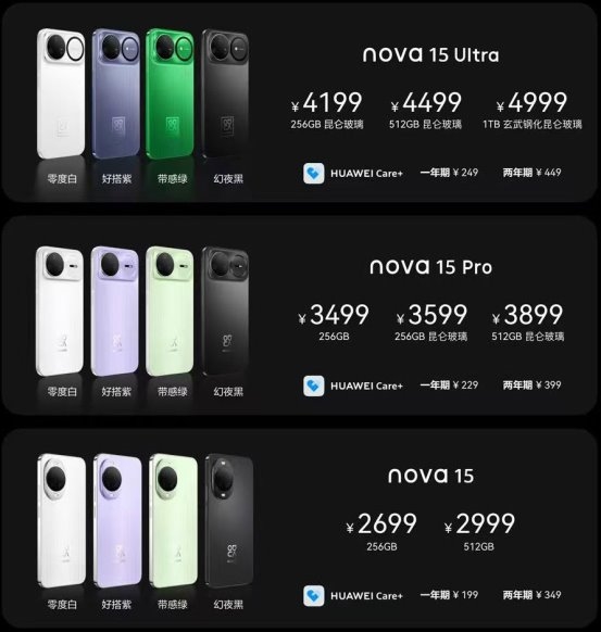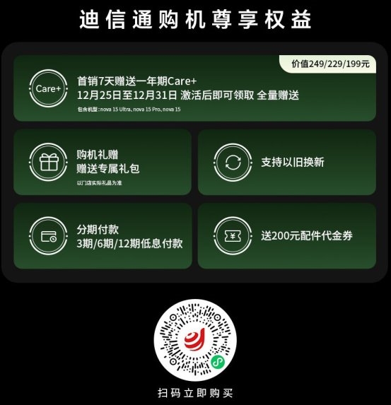最后,华为nova 15系列已在迪信通正式开售,售价2699元起,购机最多可领30天“鸿蒙生态日日新”签到红包,还限时加赠最高价值249元的1年期HUAWEI Care+用机保障,更有赠送礼包、3/6/12期低息分期付款等迪信通专属权益!想要入手的朋友,可前往【迪信通官方商城】微信小程序或迪信通线下门店购买。