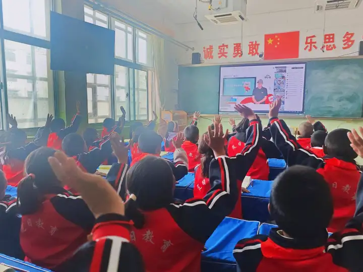 2025年6月,西藏日喀则市定日县加措乡完小的学生在远山博学课上与俞敏洪老师打招呼。