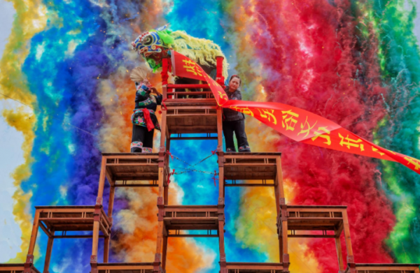 曙光村的麒麟狮子队用八仙桌搭建了十几米高的高台,一边演艺着剧情,麒麟一阶阶的跳上最高处,远看色彩斑斓、栩栩如生的麒麟在舞者操控下腾挪跳跃,寓意吉祥降临、辟邪纳福,为活动增添了浓厚的喜庆色彩。