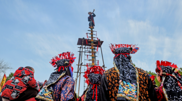 其后,活动现场举行了惊险刺激的传统上刀山环节,非遗传承人石进海先生展现了敏捷的身姿与过人的胆识,在仪式过后示范性快速的爬上了刀梯,吹响了号角。上刀山活动,是一种古老的图腾文化演变,在全世界范围内都有类似的图腾。上刀山作为地域文化的一种特别表现形式,历经百余的传承流变而至今不衰,表现了这一民间文化的生命力,而且对强化文化认同,具有不可替代的重要作用。它的丰富内容和基本特征及其传承历史,在我国古文化中实属罕见,对它的抢救、传承和保护有着很高的价值。