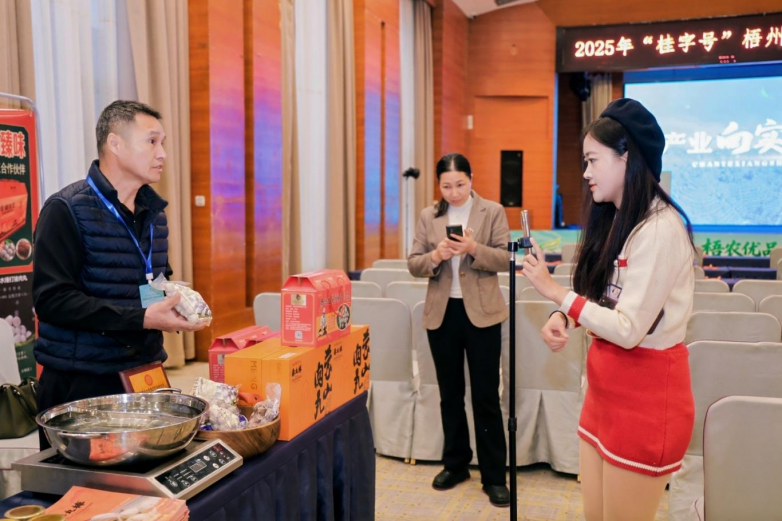 随着启动仪式顺利举行,梧深两地产销合作正式拉开序幕。意向签约仪式上气氛热烈,4家梧州供货商与4家大湾区采购商现场达成合作意向,覆盖茶叶、粉葛、特色果蔬等多个品类。签约后,网红直播、产品品鉴与自由交流同步升温,线上主播沉浸式讲解梧州农产品特色,引导网友互动交流;线下采购商近距离品鉴、精准磋商,不少企业当场敲定初步采购计划,形成“双线赋能”的产销对接热潮,大幅提升对接效率。