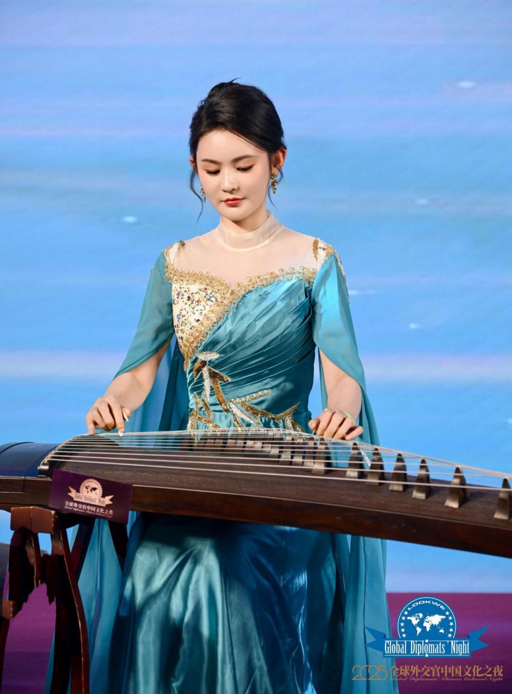 舞台上,张明慧身着定制礼服用古筝演奏《青花瓷》,为来自全球170多个国家的驻华外交官及国际友人献上一曲融合东方美学与现代创新的视听盛宴,熟悉的旋律响彻全场,筝声清澈如瓷,旋律婉转似笔,勾勒出烟雨江南的朦胧意境,更传递出中华文化“中和雅正”的美学精神。