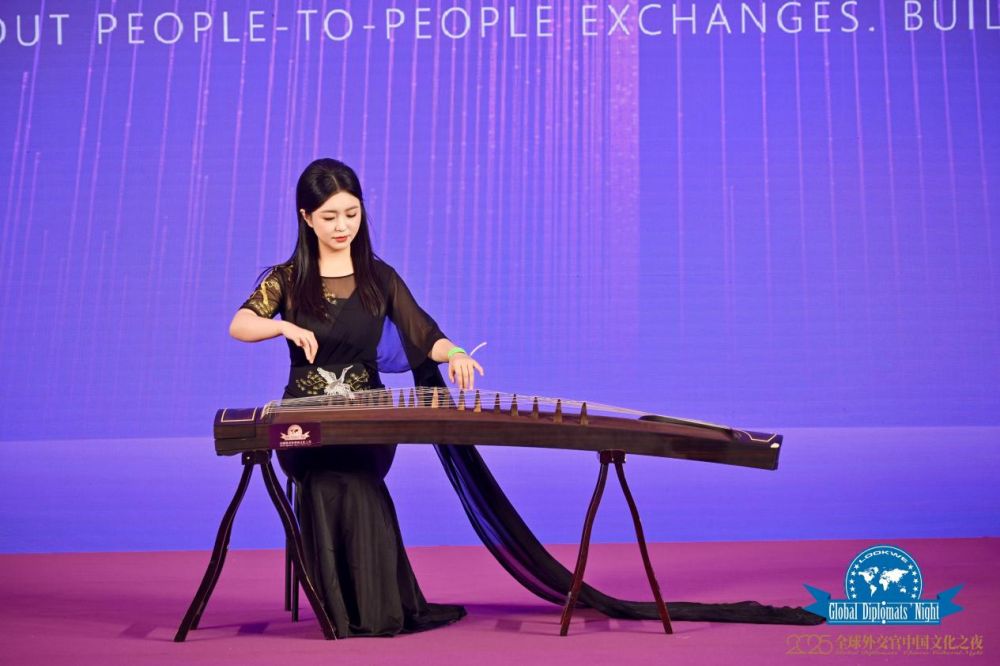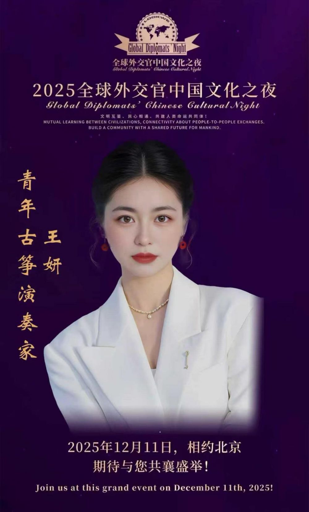 2025年12月11日,以“文明互鉴,民心相通,共建人类命运共同体”为主题的第十二届“全球外交官中国文化之夜”在北京圆满举行。本次活动吸引了来自全球超过170个国家的驻华外交官、国际组织代表及中国企业界人士近千人参与。青年古筝演奏家王妍作为华夏礼乐艺术团代表受邀出席。