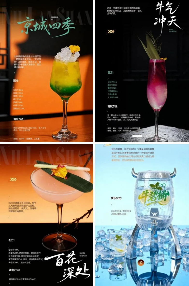 金标牛轻口味白酒还打破了传统白酒的厚重礼盒模式,坚持光瓶但充满设计感。瓶身二维码链接着一个“潮饮说明书”,提供纯饮、冰镇、Highball、中式鸡尾酒等创意喝法,将饮酒从“社会课”变成可探索的“小游戏”。