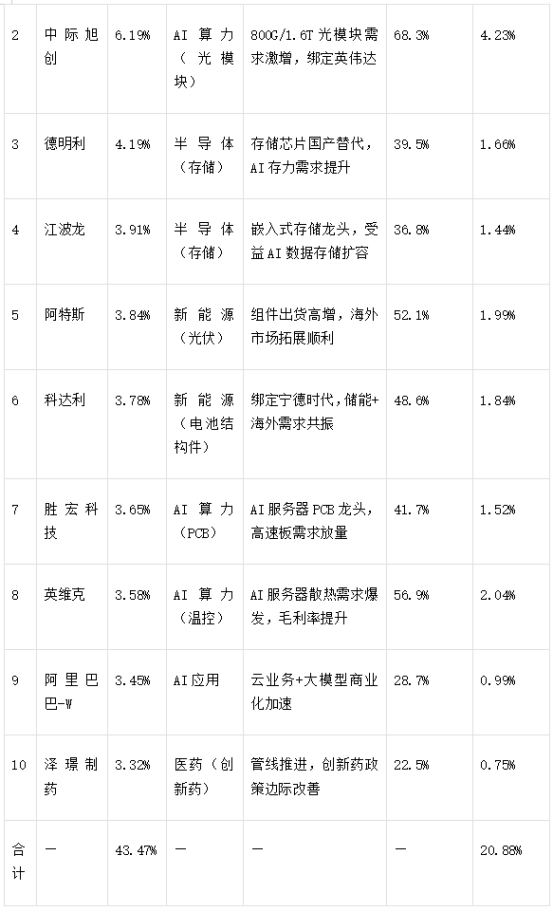 2. 半导体主线(合计持仓8.10%,贡献3.10%)核心驱动:德明利、江波龙受益存储芯片国产替代与AI存力缺口,存储价格回暖推动业绩与估值修复,是AI算力的重要配套收益端。收益逻辑:国产替代+AI存储需求共振,中小市值存储标的弹性突出,成为半导体板块的高收益细分。